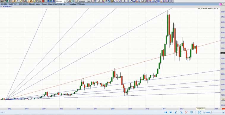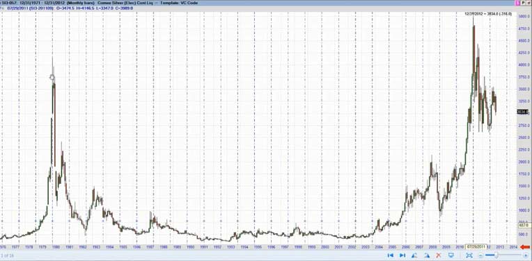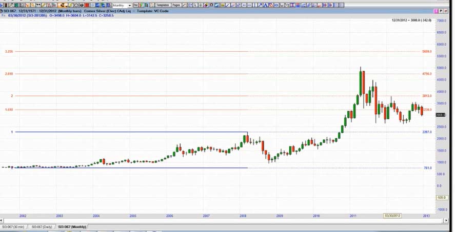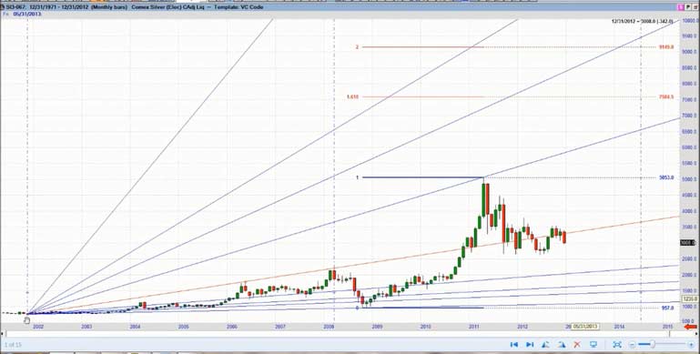 The minutes of the Federal Open Market Committee's December meeting "sucked all of the oxygen out of the room for gold bulls - and if not for the reversal in silver, I believe the sell-off in gold would be more pronounced," said Steve Roy, Chief Technical Analyst for Equity Management Academy. Gold's weakness was set off by Thursday's release of the minutes from the Fed's last meeting, which showed that several Fed officials thought the central bank would be able to slow or stop its bond purchases - a method of increasing monetary stimulus that goes beyond low interest rates - well before December 2013. Silver's slip Friday made its value at its cheapest compared to gold since late August, with 55.76 ounces of silver now equal to one ounce of gold, against 50.4 in early December. Gold's price falls may be due to profit taking by speculative players. Since December 20th, gold had risen from $1,638/oz to $1,694/oz or by 3.5%. It may also be the case that bullion banks with large concentrated short positions are using the pretext of the Federal Reserve minutes to manipulate the price lower - both to profit and to allow them to close out their significant short positions at more advantageous prices and possibly even go long. "Fed trying to suck and blow at the same time. This was an effort to bomb real assets. It will fail ," commented Eric Sprott from Sprott Asset Management on a phone interview. For the first time since the financial crisis started five years ago, the Federal Reserve has at last made its first signal that its extraordinary loose monetary policy will start to get tougher. But, the minutes show, the central bank is starting to say, enough is enough. Of the crowd that supported bond buys, a few say they should continue until the end of the year, and several said it could stop, or slow, well before then. Without any specific strategy or defined plan to replace Operation T wist moving forward and beyond the 2013 deadline, it seems very clear that the door is wide open to introduce QE4. What form it will take is anybody's guess. This will come on the face of a deeper problem as they try to negotiate the next round of the Budget Deficit ceiling and the U.S. Debt Crisis. In 2008, publicly held debt as a percentage of the economy ( GDP ) was 40.5 percent, nearly four points below the post-World War II average. Since then, the debt has increased by 45 percent. The President's FY 2013 budget would increase the debt to 76.5 percent by 2022, despite $2 trillion in tax hikes. In recent decades, Japanese governments have piled up debts worth some ???11 trillion ($14.6 trillion). This corresponds to 230 percent of annual gross domestic product, a debt level that is far higher than Greece's 165 percent. Domestic banks and insurers have purchased 95 percent of the country's sovereign debt using the savings deposits of the general population. Experts warn that this system cannot go on for much longer. Takatoshi Ito, an economics professor at the University of Tokyo, have calculated that even if the Japanese people invested all of their assets in sovereign bonds, it would only be enough to cover 12 years of state expenditures. One additional "potential risk," is the "amount of holdings of Japanese government bonds within the banking sector," as central bank chief Shirakawa politely notes. If long-term interest rates were to rise considerably, it could affect the stability of the sector. That, at the very latest, would mark the point at which the crisis could spill across Japan's borders. In Germany, financial institutions like Mitsubishi UFJ may not be widely known, but they are still internationally networked mega-institutions that have the potential to destabilize the entire finance community. As the publicly held debt grows , net interest payments will increase dramatically, even assuming that interest rates remain low. Under current projections, real net interest costs would more than double over the next decade. Conclusion It is very unlikely that current central leaders will make any long-term fundamental changes to reduce the risk currently transferred to the world bond markets by the reckless spending and printing of fiat currency. As history shows at least in the last 300 years, it does not work. As the sentiment and perception of wealth becomes more pronounced with the realization and loss of its currency purchasing power, inflation or even hyperinflation becomes a very real threat. Currently, this threat is greater due to the fact we are in a global economy. If we sneeze China gets a cold. With this historic potential for precious metals staring us in the face and the long-term secular bull market intact, I spoke at length with Steve Roy, Chief Technical Analyst for Equity Management Academy and discussed the profit potential for the silver market for 2013 and beyond. According to Steve Roy, where the focus is managing wealth, through education. This is his forecast for Silver prices for 2013 and beyond. This analysis uses proprietary indicators, Fibonacci cycles, W.D.Gann analysis, as well as wave analysis (not necessarily that of Elliott). First, we are looking at a monthly continuation chart going back to 1971. I have used the Fibonacci expansion tool using a low in 1971 to the high in 1980. The 1.618% expansion of that move is $66.26, the 200% expansion is $81.56, and the 2.618% expansion is $106.31. I will base the rest of this analysis from the low in November, 2001 at $7.61, here. In order to get a better look, I have added a 9 month cycle from the 2001 low, and it ends in February of 2013, and again in November. Notice how, for the most part, this cycle shows highs to highs, except when the market corrected or consolidated. In this chart, I have included the Gann fan connecting the first two major tops of the move off of the 2001 low. Isn't it amazing that the high in 2011 hit the 2x1 line and sold off? This is alerting ME to accelerating movement in the up trending move. N