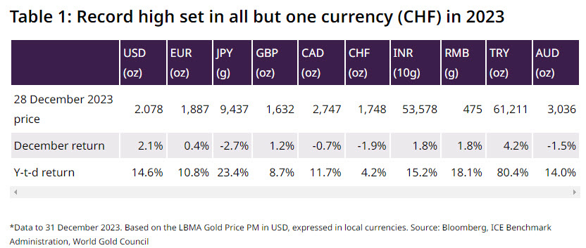 The trouble with entertaining this environment as a negative for gold is that 2023’s performance happened in precisely this environment. The only difference is inflation risks, but does anyone really expect them to simply fade away? We know that rate cuts are being mentioned as a possibility just in the first start of the year, and they are highly inflationary in nature. So the currency will be devalued further whether or not the Fed gives up on the inflation fight. The WGC also reminds us that gold set all-time-high prices in 2023 in every major currency save one (the Swiss franc): Currency debasement was one of the underlying themes in 2023, and it looks like it’s getting swept under the rug so long as the headline CPI is accommodating. But the prices can only wiggle so much before giving way to a crumbling fiat system, as we have seen in the Australian and now the Canadian dollars. Gold’s surprisingly forceful show of strength around the turn of the year might be the result of overlooked factors catching up with a weaker-than-believed U.S. dollar. It’s a reckoning many observers have called for, and one we shouldn’t be surprised to see defy standard metrics of categorization and damage assessment. China’s still making headlines with central bank bullion buying With its latest purchase of 9 tons of gold in December, China has now bought bullion for the 14th consecutive month. This is newsworthy, of course, but not to the extent readers might like. We’ve speculated that China’s newfound interest in revealing gold purchases might need to be interpreted as some kind of signal to the West. To the market watcher hyped up on the prospect of a BRICS behemoth competing with the West with China as its commander, the figures are too lackluster. China’s official stockpile of 2,000-some tons of gold is believed by few. Estimates of the real stockpile, one that was mostly accumulated off the books, place it in the range of 5,000 tons all the way up to 20,000. If we are to entertain any of that, the purchases China is making aren’t particularly relevant to its overall standing. After all, Russia would buy 20-30 tons monthly in 2018 and the like, and it’s supposed to be far worse off economically than China. Since China either wants to diversify almost as much as Russia did, or more so, it wouldn’t be excessive to assume China bought similar amounts during the same time period without reporting it. Which brings us right back to official figures. The 225 tons bought by China in 2023 are a lot, but they’re probably not that in the country’s grand scheme of financial affairs. Let us also remember that China is supposed to be one of the pioneers of the new gold standard, along with Russia. It’s mentioned as a BRICS thing, but these two seem to have the biggest currency aspirations. So who can fault gold investors for wanting something a little more bombastic out of China than reports of 9 tons of gold being bought in December? The “We know you’ve done something” element, or more specifically “know you’re doing something”, is definitely there. With an absence of any official data past what we glean from minutes of various nations, we’ll have to accept these minute announcements even though we feel there’s more. If China announced it’s buying 10 times as much gold, nobody would be surprised and we’d be discussing some kind of financial power play. This way, we’re calling the purchases underwhelming. We struggled to make sense of why China was suddenly announcing PBOC gold purchases and why in such relatively minor amounts before, but it makes sense when framed this way. Choosing to report in this manner appears to have had an intended effect of drying up most analysis and causing all but the most determined pundit to look the other way. All the while, in the background, what is probably gold accumulation on a much larger scale takes place, for reasons not so mysterious.
