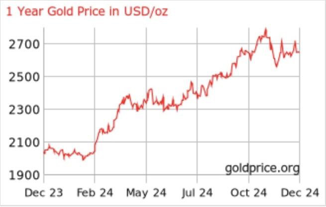 Long-time readers will know that I’ve been bullish on gold for a while. Many investors have been flocking to gold in the last few years — and for good reason. It’s a great diversifier, it protects against inflation, and it’s a safe-haven asset when things go awry. All of these things have led to a rise in gold demand and, subsequently, a run-up in gold prices. In fact, the average price of gold reached record highs several times this year — surpassing $2,700 by October. As you can see from the chart below, the yellow metal had a great year…