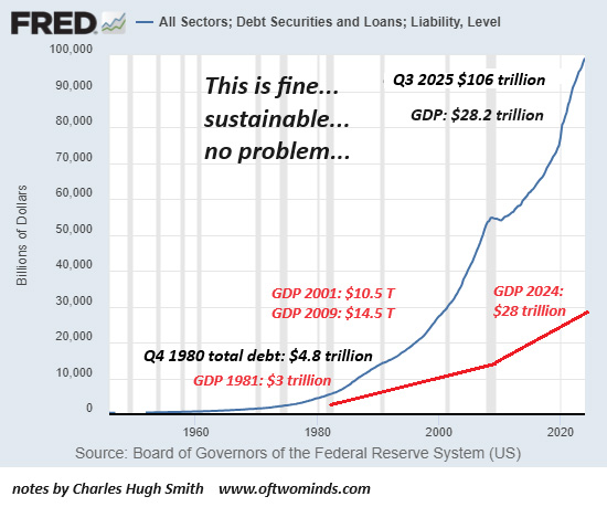 What few seem to understand is 1) the last "real recession" that cleared excesses of debt, leverage and speculation was 1980-82, 45 years ago and 2) the buffers that enabled the eventual recovery back then are gone. Where total debt was low in 1980--about 50% more than GDP--now it's triple GDP. That means "borrowing our way to expansion" isn't possible: borrowers are already unable to service existing debt, never mind more debt. As for the Fed rescuing the debt bubble by dropping interest rates to zero: recall that the Fed isn't buying more than a sliver of the $106 trillion debt; it's only generating a false signal that risk is low. In the real world, risk is rising inexorably due to excessive debt, interest payments, leverage and speculation. As for bailing the system out as in 2008, that is no longer possible, either. The system was "saved" by recapitalizing the financial sector--the source of new debt and speculation. But this time around, the economy is saturated with debt, income has stagnated and cannot support more borrowing, and the credit-asset bubbles in housing and financial assets has reached unprecedented heights of risk, i.e. fragility. This is why a recession that clears the system of excessive debt, leverage and speculation leaves a devastated economy incapable of expansion: the system is now totally dependent on excesses of debt, leverage and speculation for its survival, never mind expansion, and once that collapses (as all bubbles do), the signaling, confidence and wealth that enabled the bubble will no longer exist. As for saving the system by converting fiat money to precious metals or cryptocurrencies: the debt--and the income needed to service the debt--will also be converted, and that doesn't change the inevitable collapse of credit-asset bubbles and all the economic activity that depended on the permanent expansion of that credit-asset bubble. This is why a recession will catalyze a collapse of the credit-asset bubble-dependent economy down to its foundations. A re-inflation of a new credit-asset bubble will be viewed as the "solution," but that unstable system will no longer be viable. The real solution will be re-arranging the economy to thrive not on credit-asset bubbles but on productivity gains that are widely distributed to all the productive elements, not just the wealthiest asset owners. This process will be time-consuming and difficult, as all the "winners" in the current bubble economy will expect both a return to outsized gains and a continuation of their outsized share of the gains. Neither will be possible, as the changes will demand time, sacrifice and massive long-term investment in productive assets. The systemic risks inherent to a credit-asset bubble-dependent economy cannot be extinguished, they can only be cloaked or transferred to others.These artifices enable the expansion of the bubble at a cost paid by everyone when the system's self-liquidating dynamics pop the bubble.