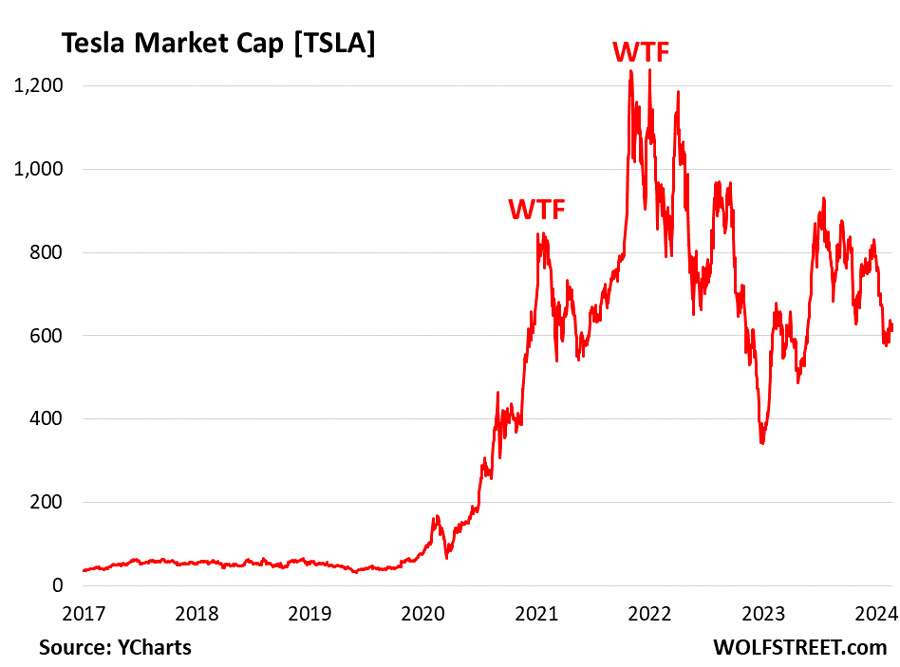 The utter mania around generative AI that has suddenly gripped corporate America led to an explosion in sales of high-dollar and high-margin systems of GPUs for Nvidia. Just about every major company is touting its progress with AI – for now, mostly just spending money on it – and periodically there are hilarious stories about generative AI’s not so intelligent work. I mean, can you fire AI if it screws up badly enough? Or is that suddenly a human’s fault? The amounts of money thrown at generative AI from all directions are just vast. And Nvidia is getting its share of the pie. Nvidia’s revenues might hit $100 billion in 2024, knock on wood, up from $27 billion in 2022. And it just might, or might not, surpass Tesla’s revenues, which were already $97 billion in 2023. These price spikes are a state of mind: See Tesla.So we just accidently remembered that Tesla’s stock too went through these WTF spikes until it hit $414.50 on November 4, 2021, and then plunged 70% over the following year and was inducted into our pantheon of Imploded Stocks in December 2022, when its shares hit $123, after which they dropped some more. These spikes unwind brutally. Then came the big rally through mid-July 2023, and then the shares spiraled down again, and today they’re down 54% from the peak in November 2021, and they’re still overvalued though Tesla has become a much bigger and a much more successful automaker since the all-time high in November 2021. Since that all-time high, Tesla has become very profitable. Its Model Y has become the #1 best-selling model in the world, blowing away Toyota’s Corolla, and it has become the #2 best-selling model in the US, just behind Ford’s F-series truck. And since the all-time high, Tesla opened two new factories, one in Germany and one in Texas, and production and deliveries have soared, and it’s eating market share of the legacy automakers in big gulps, and despite its already substantial size, its global deliveries jumped by 38% in 2023. And yet, over those two years when Tesla’s business continued to boom, Tesla’s market cap plunged by over $600 billion. Turns out, these WTF spikes are a state of mind. And when that state of mind changes, the spikes unwind.