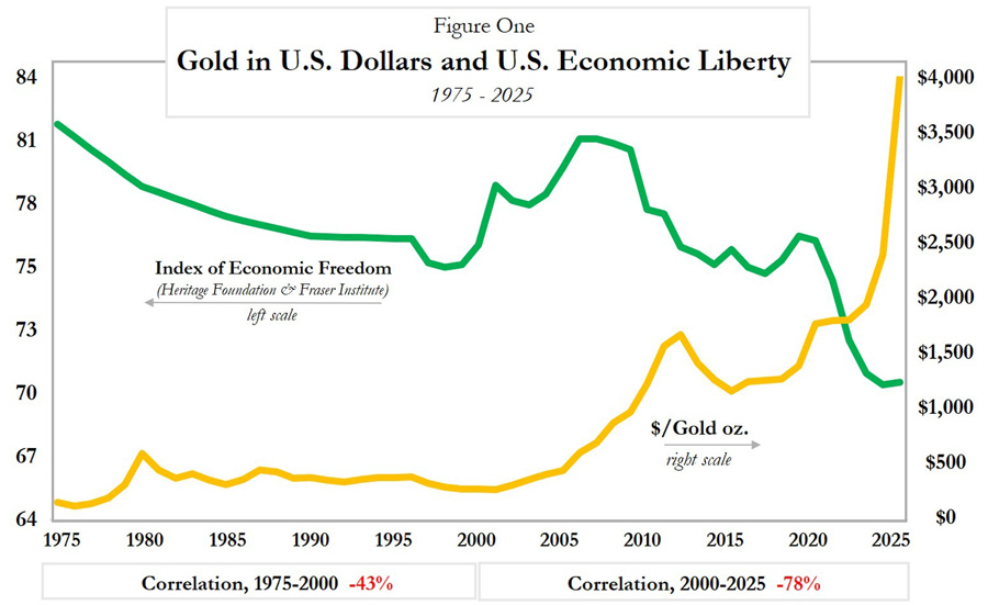 The theme of Gold and Liberty is straightforward: the statuses of gold-based money and political-economic liberty are intimately related. When a government is sound, so also is money. One of the book’s premises is that sound money is gold money (or gold-based money) because it’s economically grounded, non-political, and exhibits a fairly steady purchasing power over long periods. A second premise is that while sound government makes sound money possible, sound money alone can’t ensure fiscal-monetary integrity in public affairs. A sound government is, in this sense, one that respects private property and the sanctity of contract, a state that’s constitutionally limited in its legal, monetary, and fiscal powers. Sound money is a predictable and reliable medium of exchange, serving as a reliable yardstick due precisely to the relative stability of its real value (that is, “the golden constant”). Unrestrained states “redistribute” wealth rather than protect it, tending to spend, tax, borrow, and print money to excess. That erodes an economy’s financial infrastructure. The dollar-gold price reached yet another all-time high milestone ($4,000/ounce) in October, having surpassed $3,000/ounce last March and $2,000/ounce only thirty months ago. So far this month, it has averaged $4400/ounce – triple its level in March 2020 (when COVID lockdowns and subsidies began). Gold breached $1,000/ounce sixteen years ago, amid the financial crisis and “Great Recession” of 2009. Only two decades ago, it was $500/ounce. What Bretton Woods Got RightUnder the relative discipline of the Bretton-Woods gold-exchange standard (1948-1971), when the dollar-gold ratio was officially maintained at a steady level ($35/ounce), the Fed’s main job was to keep it there and issue neither too few nor too many dollars. Its job was not to manipulate the economy by gyrating interest rates. The dollar wasn’t a plaything in foreign exchange. Both US inflation and interest rates were relatively low and stable – not so since. Gold and Liberty illustrates how the commonly cited dollar-price of gold is really the dollar’s value (purchasing power) in terms of real money, such that a rising “gold price” reflects the dollar’s debasement by profligate politicians. When this occurs – due largely to perpetual expansion of the fundamentally unnatural, unaffordable, and unsustainable welfare-warfare state – public finance (spending, taxing, borrowing, money creation) becomes both political and capricious. At the base there’s an erosion of real liberty. From that comes money debasement, the trend since the US left the gold-exchange standard in 1971. The value of a monopoly-issued (fiat) currency reflects the competence and quality of public governance no less than a stock price reflects the competence and governing quality of a private-sector company. The empirical record makes clear that the US dollar held its real value (in gold ounces) for most of the period from 1790 to 1913, when government spending was minimal and there was no federal income tax or central (government) bank. In contrast, since the US established its money monopolist (the Federal Reserve) in 1913, the dollar, whether measured as a basket of commodities or consumer goods, has lost roughly 99 percent of its real purchasing power, most of that since the abandonment of the gold-linked dollar in 1971. Debasement doesn’t get much worse than 99 percent – unless the loss occurs quickly and catastrophically, as in a hyperinflation. That’s not impossible in America’s future. Having re-read Gold and Liberty recently, I feel both pride and chagrin. I’m proud that it refutes many monetary myths, gets the analysis basically right, and is prescient. It’s got solid data, history, economics, and investment advice. But its main, most helpful purpose is to make clear that money, banking, and the economic activity they support remain sound only in a capitalistic setting. That is, when government sticks to protecting rights to life, liberty, and property, by providing the three necessary functions of police, courts, and national defense. Measures of Gold and FreedomWhy was this not the path taken this century? Why has government been expanded so much that it now routinely violates rights and spreads chronic fiscal-monetary uncertainty? Where’s the case, made so well in the second half of the twentieth century, for a more classically liberal political economy? In short, where have all the pro-capitalists gone? They were once dominant – and influential. Given the foundation laid by “Reaganomics” (1980s), the end of the USSR and the Cold War (1990s), plus US budget surpluses four years running (1998-2001), the first quarter of the twenty-first century could have entailed a still-purer capitalist renaissance. Instead, vacuous voters and pandering politicians from everywhere along the ideological spectrum have preferred more welfare, more warfare, and more lawfare. Many youths in recent decades tell pollsters they prefer socialism to capitalism (whether from ignorance or malevolence isn’t clear). New York City now has an overtly socialist mayor. Compared to 1995, America now has a larger, but still-burgeoning, welfare-warfare state that necessitates massive borrowing and money printing, as tax avoidance and evasion tend to cap the state’s direct “take” (see Hauser’s Law). Unfortunately, the gains of the last quarter of the last century seem to have been squandered in the first quarter of this century. Monetary myths persist. Some have proliferated and worsened. Statists push a capricious “modern monetary theory” in hopes of more easily funding a burgeoning welfare-warfare state with minimal resort to taxation. Influential Keynesians and policymakers still insist that inflation is caused by “greed” or by an economy that “overheats” and thus warrants a periodic recession. Central banks this century seem more reckl