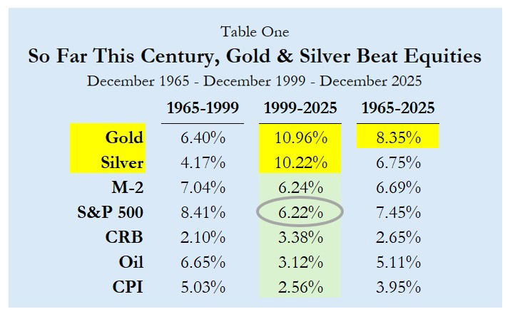 It’s as clear now as it was in 1995 that gold is an ideal monetary standard, even though sovereign powers at times (and for the entirety of this century) have refused to recognize or use gold for that crucial purpose. But consider just one important implication, pertaining to investments. Precisely because (and to the extent) sovereigns refuse to recognize gold, to be fiscally free (profligate), the result is nonetheless bullish for gold. By not making their money “as good as gold” and precluding a return to a gold standard, sovereigns make possible returns on gold that are very good indeed – often superior to those on the most popular alternative: equities. Table One illustrates how fiscal profligacy and monetary excess have favored returns on gold relative to those on the S&P 500. Not shown is that gold has outperformed the S&P 500 in nearly two-thirds of the years this century, by an average of +17 percentage points per year; it underperformed only one-third of the time by an average of -14 percentage points. Oddly, most investment advisors eschew gold and routinely recommend large portfolio shares in equities. Friends of liberty and prosperity may feel chagrin, as do I, about this century’s innumerable, unnecessary financial debacles. But they can also feel consoled, satisfied, and even gleeful if they’ve trusted gold more than central bank alchemists. They’ve likely been mocked – by fans of fiat currency or cryptocurrency alike – for clinging to their “mystical metal,” “shiny rock,” or “barbaric relic.” But name-calling isn’t a good argument – nor good investment strategy.