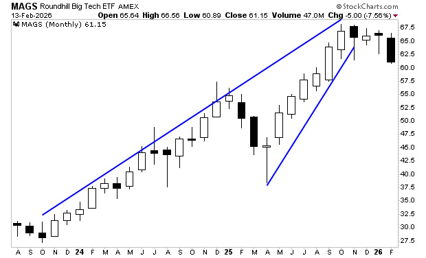 Soon after this statement, the AI-trade began to stagnate. Big Tech/ the Mag-7 which are THE primary AI-companies in the market, spending over $400 billion per year on the AI-build out peaked in September 2025. They’ve since traded sideways for six months. And unfortunately for the stock market bulls, the MAG-7 ETF has broken down out of a massive bearish rising wedge formation.