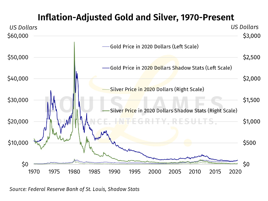 Back in 2020, Lobo Tiggre of the Independent Speculator did just that. He calculated historical precious metal prices, but adjusted for inflation using Shadowstats’ numbers. In the chart below, the Shadowstats-adjusted silver price is in green, and the Shadowstats-adjusted gold price is in blue.