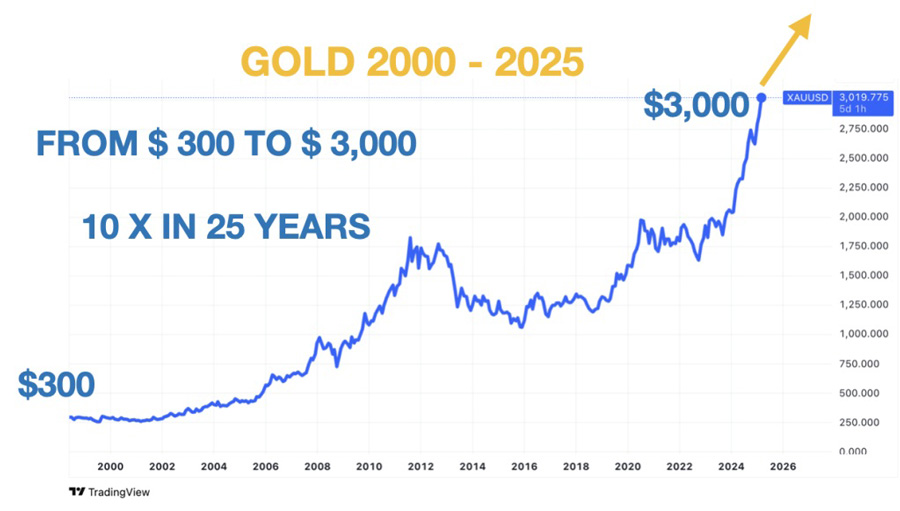 WE HAVE FINALLY ARRIVED So, what do I mean by that? Simply, we are now at the point when investors must take The Current or lose it all. Let me just repeat what I have said many times: Forecasting time and price is a mug’s game. But we all do it sometimes. This is a lesson I have learnt after about 65 years of market experience. Instead of time and price, it is much more important to understand TRENDS and RISKS. This is what led me (in 2002 at $300) to purchase larger amounts of physical gold for ourselves and the investors we advised, based on our wealth preservation principles. Gold had then corrected for over 20 years, and a credit explosion was in the making. At the time, I told major clients to put more than 50% of their liquid assets in physical gold. They haven’t regretted it. And today, for the first time in the last 25 years, main stream media and investors are starting to talk about gold. So, it has taken a quarter of a century and a 10-fold increase in the gold price for the public to wake up! GOLD $3,000