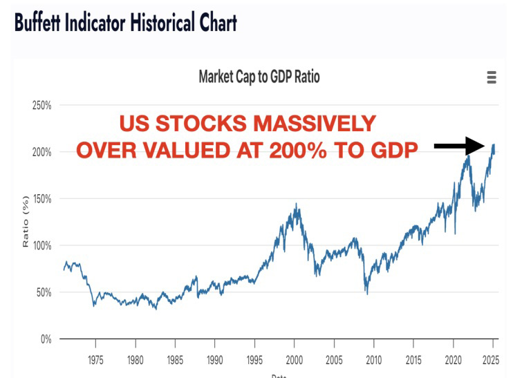 For some time, $3,000 has been an obvious magnet for gold, as I have written about many times. But $3,000 is certainly not a target – it is not even a price where gold will consolidate. It is just a round figure where gold will not stop for long. As I wrote in a recent article: NEXT GOLD MOVE WILL SURPRISE THE WORLD. Many investors have not bought gold recently as they have been waiting for a correction. But we have told investors that gold is very unlikely to pause at this level. Instead, once properly past $3,000, we are likely to see an acceleration. Massively overbought stocksWhere I was wrong on the trend was in stock markets. I definitely thought that 2008 would be the start of a secular bear market, but massive money printing created miracles and fuelled markets for another 17 years.