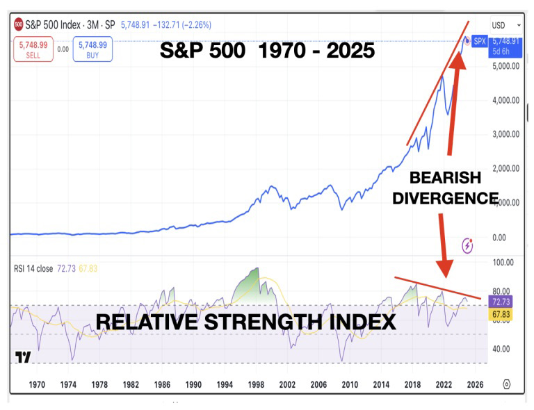 Another reliable indicator is bullish/bearish divergence. The S&P chart below shows a bearish divergence since 2018. This means that the Momentum indicator (RSI) has been showing lower tops since 2018 in spite of a much higher price. This is a very bearish long-term signal.