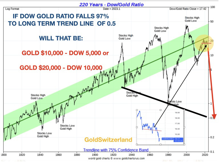 But back to “WHY WE HAVE FINALLY ARRIVED”. So, I have just explained that gold (and silver) is about to accelerate. So, if we look at the Dow Gold Ratio (the Dow divided by Gold), back in the year 2000, the ratio was 45. It is now 14. The ratio has just broken a 12-month trend line and is now about to accelerate down. This means the Dow has fallen 69% against gold in the last 25 years. More importantly, if the ratio reaches long-term support at 0.5, it would mean a 97% fall from here. But I doubt it will stop there. That could mean Gold $20,000 and Dow 10,000.