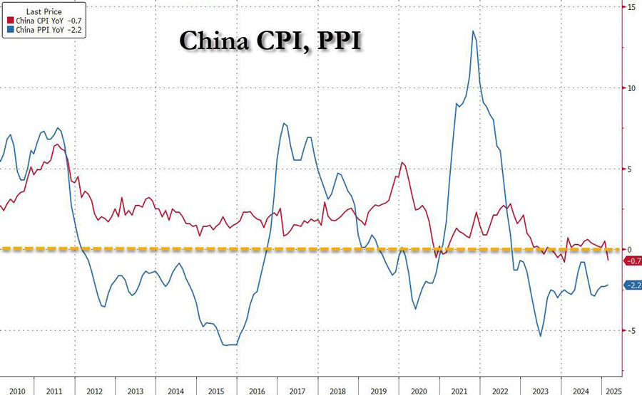 • China’s CPI turned negative for the first time in 13 months, falling 0.7% in February from a year earlier. The core measure, which also slid, highlights the need for policymakers to deliver stimulus quickly. BBG