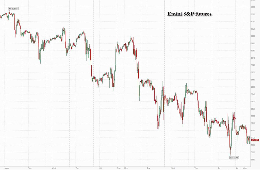 US equity futures continue their relentless grind lower, as they trade just off session lows, down more than 1% as the "Trump Dump" selloff continues amid growing concerns about the health of the US economy. As JPM notes this morning "today there is a global de-risking but let’s see if Int’l Eqys outperform on the move lower or if the US can see a relief rally"; so far the answer is a resounding no with both European and Asian stocks tumbling, after Trump declined to rule out a recession due to his policies, pointing to a transition period for the economy. As of 8:00am, S&P futures are down 1.2% to 5,705 following the worst week for the benchmark index since September, while Nasdaq 100 futures slide 1.1% with all Mag7 stocks sharply lower to start the week: Tesla shares fell about 3% in premarket trading inching toward erasing their post-election gains, and most other Big Tech names also dropped, including AI bellwether Nvidia. European stocks slipped 0.4%. Treasuries are down 4-6bps amid rising recession fears, while the USD continues its post-Trump slump. In commodities, Ags and Energy are higher green while precious and base metals slide after China’s recent data confirmed deflation has returned to the second largest economy. Today’s macro data focus is on NY Fed’s 1-Year Inflation Expectations.