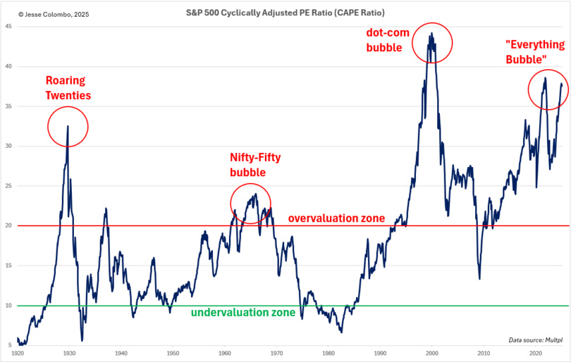 Beyond housing, another major bubble I expect to burst is the one in U.S. stocks. Numerous indicators confirm that the stock market is dangerously overvalued and primed for a mean reversion—a correction that will drag down inflated stock prices and serve as both a symptom and a catalyst of the coming recession.