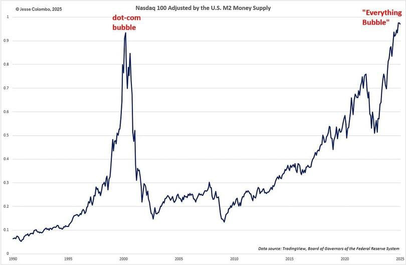 Tech stocks, in particular, are wildly inflated, as evidenced by the Nasdaq 100 adjusted by the U.S. M2 money supply, which represents the total amount of dollars in circulation. This metric reveals that the Nasdaq 100—and tech stocks as a whole—are now even more overvalued than they were during the late-1990s dot-com bubble, which ended in a spectacular crash.