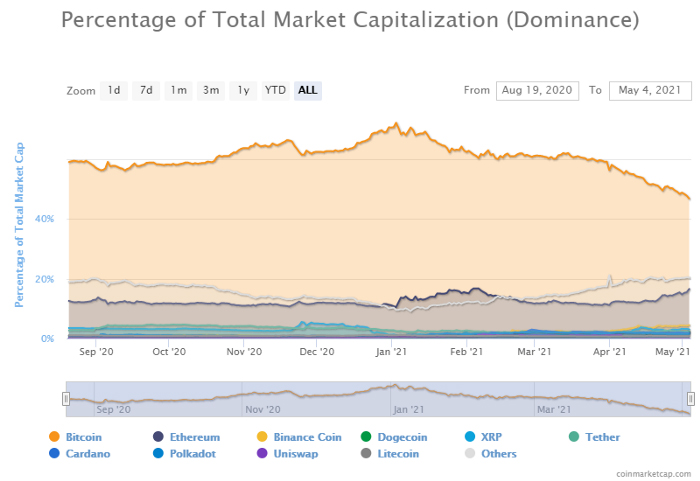 Every bull market has multiple cycles, and each cycle has its own tenor. The first cycle of the current run was fairly simple, it was the ascent of Bitcoin. It could be seen in the rise of Bitcoin dominance over all other coins, a metric that rose from last summer to the start of this year and peaked at 70%, a 4 year high.