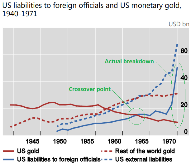 Chart Source: Bullionstar In fact, the numbers show that from inception, it was already on an unstable path. The US began the system with more gold than foreign liabilities, but that gap quickly began closing within the first few years. By the late-1950s, US external liabilities exceeded US gold reserves. By the mid-1960s, the subset of US external liabilities that were owed to foreign officials exceeded US gold reserves, which was the true crossover point where the system became troubled. And by 1971, the system broke down and was defaulted on by the United States.