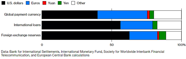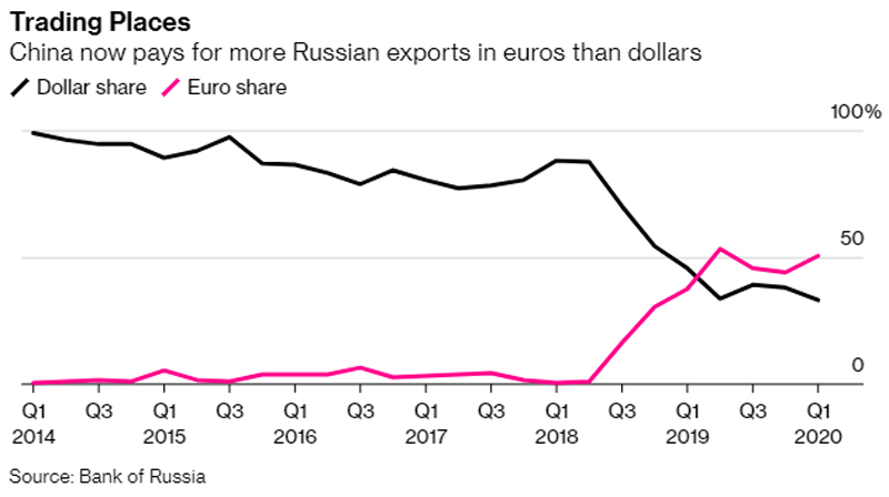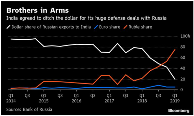 Chart Source: Bloomberg Six years ago, Russian exports to China were over 98% dollar based. As of early 2020, it’s only 33% dollar-based, 50% euro-based, and 17% with their own currencies. And importantly, Russia’s exports are significantly energy-based and commodity-based, which gets to the heart of the petrodollar system. Similarly, the article shows that Russian exports to Europe have become increasingly euro-based as well. Six years ago, Russian exports to Europe were 69% dollar-based and 18% euro-based. Now they’re 44% dollar-based and 43% euro-based. Plus, Bloomberg reported back in 2019 that Russia has been achieving similar results with India as well, with a remarkable drop from nearly 100% of exports to only 20% of exports being priced in dollars: