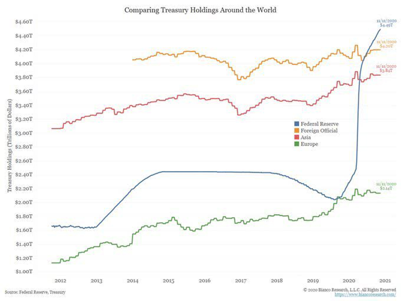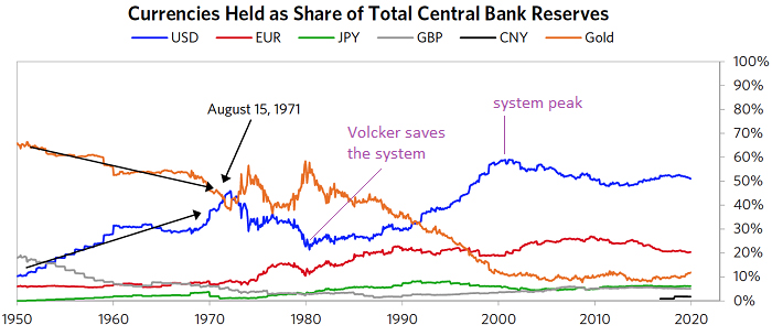 Chart Source: Ray Dalio, The Changing World Order, purple annotations by Lyn Alden Another way of looking at it is that it peaked in 2013 when foreigners owned a record high percentage of US debt, and China declared that it was no longer in their interest to keep accumulating Treasuries. Since then, the percent of Treasuries owned by the foreign sector has diminished. As a base case, I expect this gradual outcome to continue happening, whether the United States participates or not, as various major powers continue to increase their usage of non-dollar payment systems over time, and an increasing percentage of US federal debt becomes owned by the Federal reserve and the US commercial banking system. The new RCEP trade agreement between many Asia Pacific nations, which creates the largest trade bloc in history, could further accelerate that trend, and new technologies including blockchains and domestic government-issued digital currencies, open up novel opportunities for new payment networks as well. The Fast Restructuring Option On the other hand, a structural change could happen with a shock and stepwise change, like the end of the Bretton Woods system. This can happen in a few ways, but becomes more probable if the United States decides to actively promote a change rather than defend the status quo. On the legislative side, the United States could reverse some policies that I described in “The Big Tax Shift” which would make onshore labor more competitive. This would include things like cutting payroll taxes or performing similar measures, and re-arranging other spending and taxing priorities, to emphasize some degree of industrial onshoring. On the Treasury/Fed side, the easiest way would be through foreign-exchange reserves. Countries manage their currencies primarily with their foreign-exchange reserves, which consist of foreign currencies in the form of sovereign bonds, and gold. In some cases they also own foreign equities and other assets. These foreign-exchange reserves held by central banks around the world have multiple purposes:
