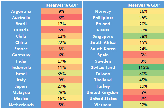 Because the dollar is the axiom of the current global monetary system, Treasuries are the biggest component of most countries’ foreign-exchange reserves. The US itself doesn’t have much foreign exchange reserves. Emerging markets often have the biggest reserves, since they need them the most, but a handful of developed nations also have huge reserves as well, and just about every country has more reserves as a percentage of GDP than the United States. This chart shows foreign-exchange reserves as a percentage of GDP for dozens of countries, as of spring of this year when I assembled it. In terms of comparative magnitude for most countries, it hasn’t changed much since then: