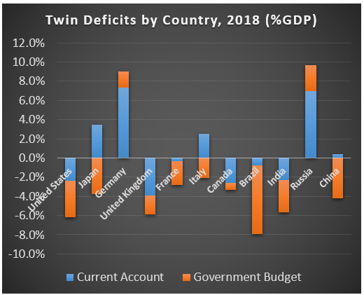 Chart Source: St. Louis Fed In addition, while Japan and Europe and China have positive trade balances and current accounts, the US has the aforementioned Triffin dilemma issue of structural trade and current account deficits. Here’s a chart I put together in 2019 using data from late 2018, showing that pre-pandemic, the US had the biggest twin deficit among major developed nations: