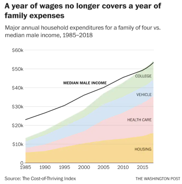 Chart Source: EPI Now, the median American male has trouble affording the expenses for a family that he could easily afford decades ago. Either an above-median income is required, or two incomes are required, because the median income just doesn’t support a family like it used to: