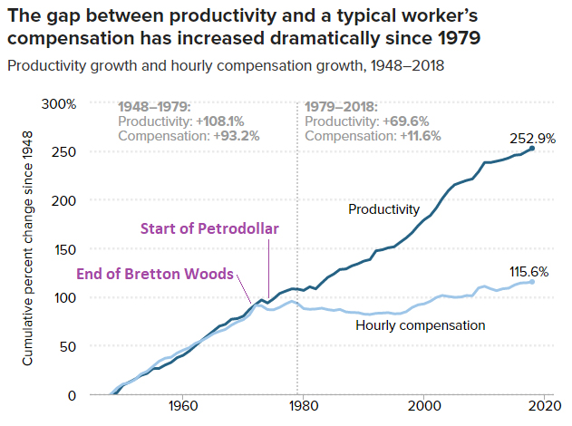 Chart Source: St. Louis Fed The United States is ranked #27 in the world for social mobility, which puts it at the bottom range of developed countries. For Americans, their family of birth dictates their lifetime economic potential more-so than other advanced peers. With a few exceptions, we have to go down into emerging/developing markets to find lower social mobility scores than the United States has. Median American wages decoupled from productivity since the 1970’s, and that gap was arbitraged by those at the top thanks to offshoring/automation: