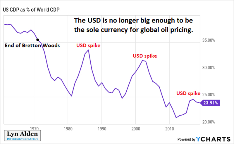 A System Without a Purpose For a while, the petrodollar system made a degree of sense, despite its trade-balance flaws. Unable to maintain gold backing in the previous system, policymakers managed to give order to an all-fiat system. The United States was the biggest economy in the world and the biggest importer of commodities, so our currency was the only one “big enough” to be used for the global oil trade. In addition, as macro analyst Luke Gromen, who in recent years has specialized in analyzing the petrodollar system and the US fiscal situation, has pointed out that the first two decades of the petrodollar system overlapped with the Cold War. So, the system helped strengthen US hegemonic power in a divided world. Love it or hate it, the geopolitical intentions of the system architects were clear. From the 1990s onwards after the Soviet Union fell, as Gromen and others have argued, the system has made less sense, and has resulted in more US military involvement than need be (to put it lightly) as the US indirectly seeks to defend its hegemonic role without a clear direction or identity. In addition, China is now the world’s largest importer of commodities, rather than the United States. It’s challenging to maintain a system of all oil and most commodities being priced worldwide in US dollars if there is a bigger global trade partner and importer of oil and commodities than the United States. The United States still has an unrivaled military reach, but its other justifications for the existing system are diminishing. Shrinking US Share of Global GDP Despite all of this, China can’t replace the United States as the holder of the sole global reserve currency. Not even close. No single country can. And here’s why. In the aftermath of World War II, the United States represented over 40% of global GDP. By the time the Bretton woods system ended and the petrodollar system began, the United States still represented 35% of global GDP. It has since fallen to only 20-25% of global GDP: