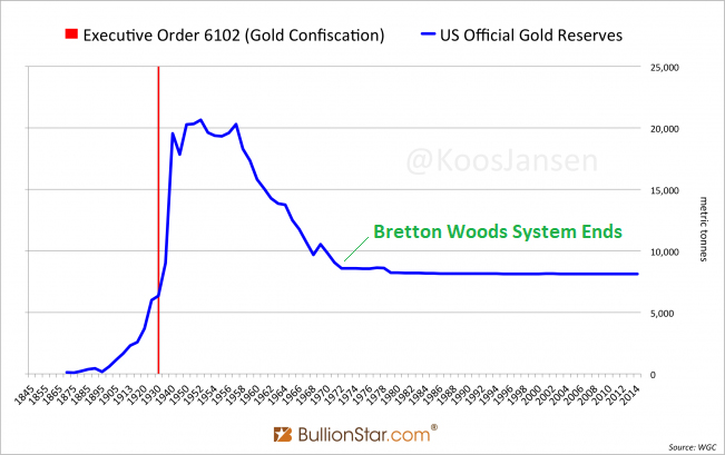 Chart Source: Bridgewater Associates The winners of the world wars devalued their currencies less than the losers, but everyone devalued. This was partly from the wars, but also just as much from the end of the long-term debt cycle. Bretton Woods System (1944-1971) The most recent handover of global reserve currency status gradually began after World War I, and was finalized in the later stages of World War II. As a result of the wars and the rise of the American economy, the center of global power shifted from Europe (and particularly the United Kingdom) to the United States. In the 1930’s, the United States government made gold ownership illegal and forced citizens to sell their gold to the government, which allowed the government to build up huge gold reserves. Then, in order to keep gold safe during the war, many countries shipped their gold to the United States. So, the United States had its own massive gold stockpile, and also served as the global gold custodian for many allies. As World War II unfolded, while Europe and east Asia were devastated by the war, the United States homeland was barely touched, and the US became the world’s largest creditor nation in the process. At that point, the Bretton Woods system was established, whereby the United States backed its dollar by gold, and dozens of other countries pegged their currencies to the dollar, and thus also had a gold standard by association. Many countries held US Treasuries, as a form of reserve collateral that was “good as gold”. The dollar was not redeemable to US citizens for gold, but it was redeemable to foreign governments for gold. During this time, the United States also began laying the groundwork for its alliance with Saudi Arabia, which would come into play with the next system. This period also saw the rise of the “eurodollar market”, referring to the dollar market that exists between banks and other entities outside of the United States and outside of the Federal Reserve’s jurisdiction, primarily centered in Europe but extending throughout the world. With the Bretton Woods system and the following petrodollar system, the United States obtained a near-global lock on the international money system. Previous empire currencies never obtained that complete of a financial lock on the world, and thus were never true “global reserve” currencies but instead were just “widely recognized and dominant” currencies. So the 1944-present status of the dollar as the global reserve currency is not perfectly comparable to pre-1944 periods of other global reserve currencies. This period was rather unique, in other words. It was the first time technology allowed the entire world to be connected together enough for a truly global war to happen, and for a truly global monetary system to come in its wake. However, after only a decade, the Bretton Woods system began to fray. The United States began running large fiscal deficits and experiencing mildly rising inflation levels, first for the late 1960s domestic programs, and then for the Vietnam War. The United States began to see its gold reserves shrink, as other countries began to doubt the backing of the dollar and therefore redeem dollars for gold instead of comfortably holding dollars. This chart shows US gold reserves as measured in metric tonnes: