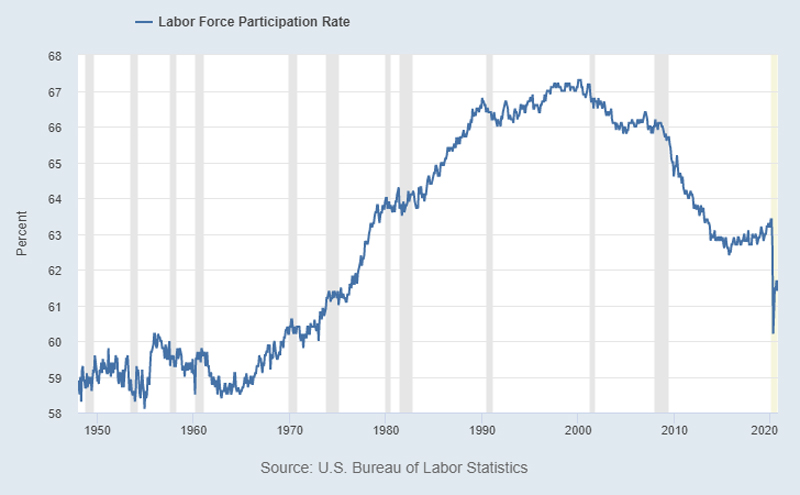 Chart Source: St. Louis Fed In other words, as we all know, the global economy is interconnected. The US usually runs into economic problems when the dollar strengthens, just like certain other parts of the world. In a strong dollar environment, US exports become less competitive, and the overall global trade environment becomes sluggish, resulting in domestic stagnation within the US as well. The 1980s dollar spike occurred in an environment with less global debt, so it required deliberate intervention to reverse. The second and third dollar spikes occurred in environments with more debt in the US and elsewhere, and thus were more self-correcting without global coordination, by unilateral shifts in monetary policy by the US Federal Reserve to protect the US Treasury market and stimulate the domestic economy. 1980s Dollar Cycle The dollar was weak in the 1970’s after going off the gold standard, and the United States and many other countries experienced rapid consumer price inflation. In the early 1980s, the new Fed chairman Paul Volcker jacked up interest rates to quell inflation. At the same time, Ronald Reagan ran large fiscal deficits by cutting taxes and increasing spending, which contributed to an economic boom. This combination of tight monetary policy and loose fiscal policy tends to be strong for a currency while it lasts. The first half of the 1980s saw rapid strengthening in the dollar. This contributed to the Latin American debt crisis; emerging markets in Latin America were unable to pay dollar-denominated debts back, resulting in defaults, recessions, and currency crises. Debts within the United States were very low, so interest rates could be kept high by Volcker for a long time, which added a lot of fuel to the dollar bull run. The dollar eventually reached an apex in 1985, when the United States and four other major countries (Germany, Japan, United Kingdom, and France) agreed to deliberately weaken the dollar in an event called the Plaza Accord so that American and European exports would be more competitive vs Japanese exports, which were dominating global trade at the time. As the dollar fell in the late 1980s and the yen strengthened markedly, money flooded into Japan, which along with their overall strong economy, led to the massive well-known Japanese equity and real estate bubble. 1990s/2000s Dollar Cycle The Soviet Union fell in 1991, leaving the United States as the world’s sole superpower, and led to a period of opening markets and rapid globalization. In the early 1990s, the United States had a recession, and saw a period of declining interest rates, and the dollar was weak overall. Emerging markets had a strong period until the mid-1990s. At that point, the United States’ economy began to do well and raised interest rates, beginning the second dollar bull run. In addition, the US baby boom generation reached its peak working age, resulting in the highest level of labor participation in US history: