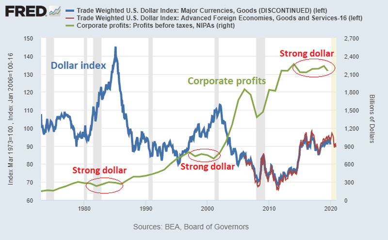 Chart Source: St. Louis Fed As the chart shows, each of the three major dollar index bull runs were accompanied by a sharp reduction in the percentage of US federal debt held by the foreign sector. The United States was still issuing debt, but foreigners weren’t buying much of it. This lack of buying by foreigners forces the US to fund its own federal deficits, meaning either its private sector or increasingly the Federal Reserve itself had to buy Treasuries, and that eventually leads to a dovish shift in US monetary policy, which plays a role in weakening the dollar and starting the cycle anew. For a second chart, we can compare the dollar index to US corporate profits, which shows that corporate profits go flat in dollar terms for a number of years every time there is one of the big dollar bull runs: