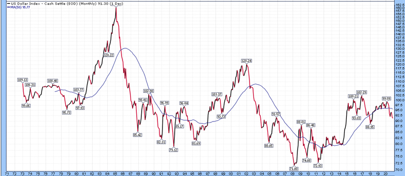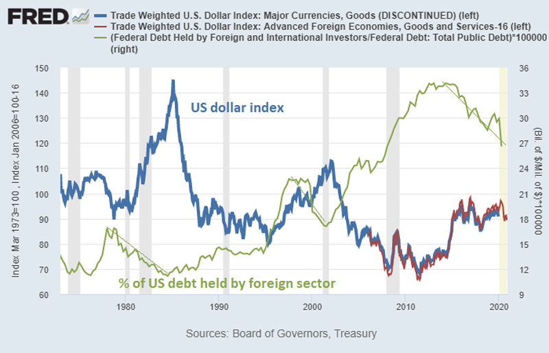 Chart Source: StockCharts.com The dollar index broke below its 50-month moving average this year, and that 50-month moving average itself now has a slight downward tilt. Could it have another one of those dollar down-legs like it had after the previous two major cycle tops? Sure. So, let’s separate being a dollar bear from being someone who thinks the global monetary system will change structurally. The two don’t necessarily go hand in hand, although they can. It’s important to treat those ideas independently, because even though I do hold both of those views over different timeframes, they aren’t the same view. Similarly, the dollar being the world’s reserve currency doesn’t necessarily protect it from major swings relative to other currencies. In fact, the depth to which the dollar is plugged into the global financial system arguably gives it bigger swings than it otherwise would have, both to the upside and downside. Causes for the Cycle The dollar cycle is based on major shifts in monetary and fiscal policy, as well as the resulting capital flows for global money that wants to chase whatever area of the world is doing well. Underlying all of this is the global monetary system as currently structured, i.e. the petrodollar system. As I discussed in my February 2020 article, “The Global Dollar Short Squeeze” and in my April 2020 article, “The $40 Trillion Problem“, governments and companies outside of the United States have a lot of dollar-denominated debt ($13 trillion at a minimum according to the BIS), but also have even more dollar-denominated assets (around $42 trillion according to the IMF and US BEA). These debts and assets were built up over decades due to those countries running trade surpluses with the United States, and from the dollar being used for the majority of global financing deals, especially for emerging markets. That dollar-denominated debt represents a consistent source of demand for dollars to service those debts. So, if recessions happen, or dollar-based global trade slows down, there can become a scramble for dollars which can be in short supply outside of the United States, causing an international dollar spike. This happened in March 2020 as the pandemic sharply diminished global trade, and oil prices collapsed. In that sense, the petrodollar system reinforced itself over time. At first, countries needed dollars so that they could get oil. After decades of that, with so much international financing happening in dollars, now countries need dollars so they can service their dollar-denominated debts. So, the dollar is backed by both oil and dollar-denominated debts, and it’s a very strong self-reinforcing network effect. Importantly, most of those debts aren’t owed to the United States (despite being denominated in dollars), but rather are owed to other countries. For example, China makes many dollar-based loans to developing countries, as do Europe and Japan. When the dollar strengthens relative to emerging market countries’ local currencies, it acts as a sort of quantitative tightening for those countries because their dollar-denominated debts go up in local currency terms relative to their assets and cash flows, which can be particularly brutal during recessions. That’s one of the key reasons why emerging market assets and economies are riskier and more volatile than developed market economies; their dollar-denominated borrowings. On the other hand, a weakening dollar can be like quantitative easing for them, as it eases their debt load relative to their local-currency cash flows and assets. Similarly, dollar-denominated assets, especially ones held by foreign governments and central banks (acquired from years of trade and current account surpluses), represent collateral with which those countries can defend their currencies, or represent assets that they can sell in order to get dollars to support their obligations if need be. During a weak dollar period, there is often a global economic boom, and nations around the world including the United States have a period of growth and prosperity. If nations are smart, they start building up big foreign exchange reserves with their dollar inflows. Within this petrodollar system, that has meant buying US Treasury securities. Countries also often use that period to take out dollar-based loans, which comes back to bite them later. During a strong dollar period, the global economy often slows, and nations get squeezed by dollar-denominated debts. They buy far fewer Treasuries, if any, and might even sell some to get dollars to service dollar-denominated debts or manage their currency. As a result, we see a clear pattern between dollar strength and the percent of US federal debt held by the foreign sector. Whenever the dollar enters one of its big bull runs, foreigners start to get squeezed, global growth slows (including US growth, due to the interconnection of the global economy), and foreigners slow down or stop their purchases of US debt. This chart shows the trade-weighted dollar index in blue (with a newer index in red spliced onto it, due to the fact that the longer-running index discontinued at the start of 2020), and the percent of US federal debt held by the foreign sector in green: