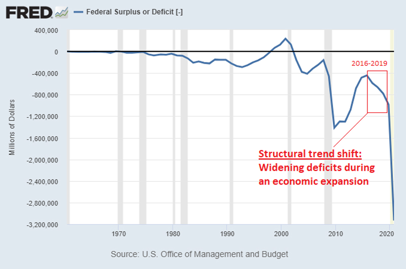 Chart Source: StockCharts.com The Dollar vs Other Currencies Some people ask why would the US dollar weaken more than other major currencies if all of them are printing a lot of money. What causes these big bear markets in the dollar? In other words, just because the US Federal Reserve turns dovish, doing plenty of QE and keeping interest rates at zero, why would the dollar be weak vs the euro, yen, pound, or other countries that are acting similarly dovish? It’s easy to argue that it should weaken against hard assets (and indeed, that’s probably the easier long-term trade), but why should it weaken vs other fiat? The first answer to that question has to do with magnitude. All major countries are acting similarly, but not at the same magnitude. US fiscal deficits as a percentage of GDP were larger than most advanced peers before the pandemic hit, and are larger than most advanced peers during this pandemic as well. Here’s a chart I had in my November 2020 newsletter about the US federal deficit, showing that it’s the first time in modern history where the United States had a rising deficit (both in absolute terms and as a percentage of GDP) during the later years of an economic expansion: