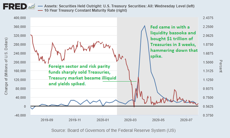 Chart Source: Bianco Research That’s not exactly how the “global reserve” currency is supposed to work. It’s like a restaurant chef eating her own cooking more than her customers do. This is what other non-global-reserve countries look like. Within one year, the Fed went from owning half as much Treasuries as foreign central banks combined, to more than them combined. As previously described, countries can only keep buying Treasuries if global dollar liquidity conditions are good. A strong dollar halts foreign accumulation of Treasuries. In addition, any impact to trade, such as a pandemic and associated economic shutdowns that crater oil demand and import/export volumes, threatens that whole system. And China isn’t recycling dollars into Treasuries for aforementioned strategic reasons. As it relates to the Treasury market, in addition to not buying much Treasuries over the past five years of this strong dollar environment, some countries began rapidly selling Treasuries in March and April of this year at the height of the global shutdown and liquidity crisis. Leading into the pandemic, long-duration Treasuries rallied as investors flocked into them and drove their yields down, but at the worst point in the liquidity crisis as the dollar index spiked to 103, even Treasuries sharply sold off. The Fed described the problem in their emergency March meeting and their subsequent April meeting. Here’s March:
