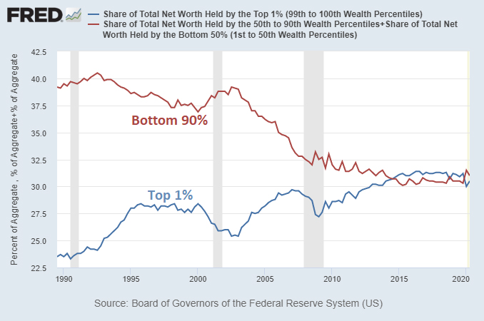 Chart Source: Credit Suisse 2020 Wealth Report The top 1% have as much as the bottom 90%, which is a lot more concentration than 30-40 years ago:
