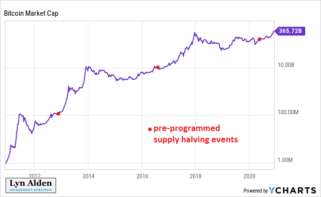 In a more benign way, a few years ago India’s central bank began issuing sovereign gold bonds on behalf of the government of India. These are government securities denominated in grams of gold. They pay lower interest rates than normal Indian sovereign bonds, because they eliminate currency risk. The government’s benefit is that they get to borrow at a lower yield. The investors’ benefit is that they get a more conservative investment, tied to gold prices instead of India’s currency, and can earn positive yield on gold exposure. Whether currencies are ever backed by gold in a broad sense again, central banks can hold gold as a reserve asset within any sort of global monetary system, such as the above-mentioned decentralized energy pricing system, or alongside digital currency baskets. Bitcoin as a Reserve Asset Dismissed by many, there is a fervent group of proponents for the idea that Bitcoin’s network effect is too strong to stop, and that it will continue to expand exponentially until it eats the global financial system, i.e. hyper-bitcoinization. As a decentralized and open source project, adopted by many programmers and proponents around the world, many intelligent people have dedicated their careers to Bitcoin. It’s hard to find a more voracious group of people than those in the Bitcoin community, and increasingly over time, Wall Street money has poured in as well. So far, Bitcoin has defied most expectations, growing from zero into a $350+ billion market cap digital asset in a little over a decade in an algorithmic price pattern that has rivaled the speed of even the most successful tech companies: