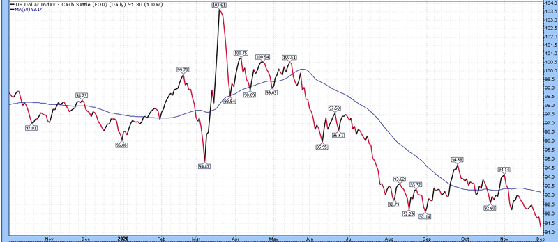 This view began forming when the Federal Reserve cut interest rates in summer 2019, and then the view solidified with a catalyst after an overnight repo rate spike in September 2019 forced the Fed to begin supplying repo liquidity. In my October 2, 2019 article, “The Most Crowded Trade“, I said to look for a weaker dollar in 2020, and also stated that the Fed would likely start expanding its balance sheet by buying Treasuries in 2020 or perhaps as early as that quarter in 2019 due to oversupply. Days later, the Fed indeed announced that they will begin buying Treasuries, and as of this writing well over a year later, they haven’t stopped. Here’s the dollar index since my October article, having fallen from about 99 to 92:
