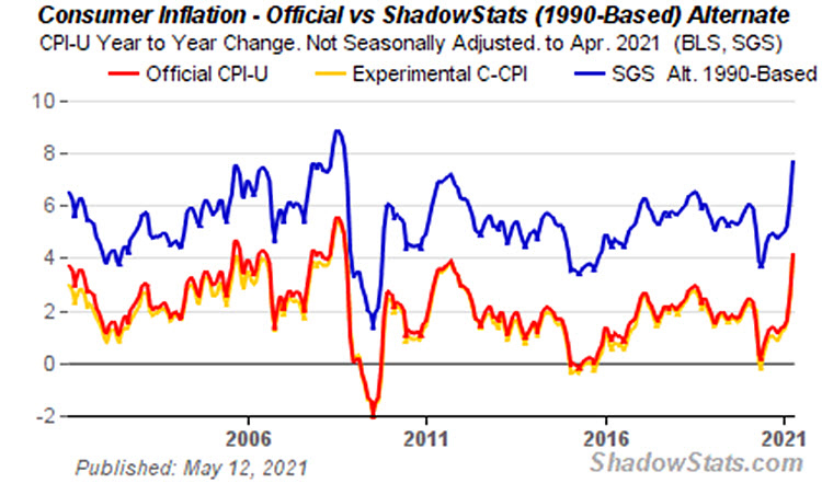 A look at ShadowStats latest update reveals an eye-popping 8% inflation. This rate is calculated using a 1990 methodology that took a consumer’s “standard of living” into account (along with food and energy inflation). Don’t make the mistake of dismissing ShadowStats based on its name. Their logic and methodology for their calculations isn’t a secret. According to the same measure of inflation the U.S. officially used in 1990, he latest rate is almost double the CPI reported by official sources (both shown on the chart below):