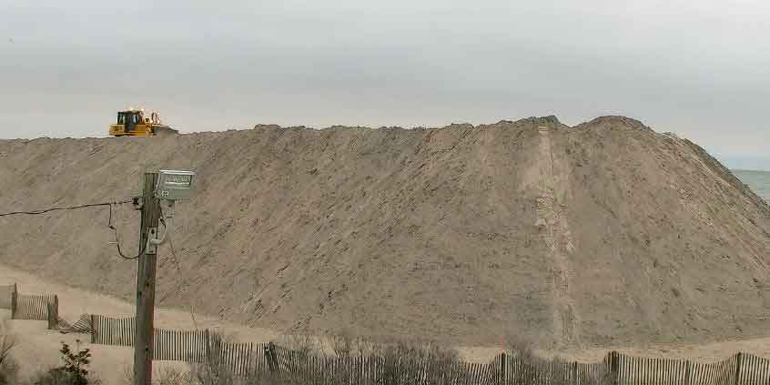 When we saw the forecast for this past weekend on Wednesday, we quickly booked a room for Friday and Saturday nights in Wildwood. Even though we are headed back down to the beach in two weeks for our annual vacation, we couldn’t pass up an 80 degree day in May. The Montego Bay hotel is one of only a few that are open all year in Wildwood. It’s kind of dumpy, the staff is grumpy and the one elevator takes five minutes to arrive. You park underneath and there is always water dripping from somewhere. It always reminds me of that condo tower that collapsed in Miami last year. The rooms are clean and the view from the 5th floor balcony is spectacular, looking out on the Atlantic Ocean. You get to see a stunning sunrise, majestic sailboats, and dolphins frolicking close to the beach. Of course it’s easier to see when there isn’t a five story pile of sand in front of your hotel and the beach access is blocked off. It’s normally peaceful when there aren’t dump trucks and other heavy machinery operating from 6:00 am until 4:00 pm. It’s also quieter when your ghetto neighbors in the next room aren’t blasting their music at volume 11. It seems the North Wildwood authorities attempt to defeat Mother Nature every year by replenishing the beach that washes away every winter during coastal storms. So they pile up tons of sand and truck it up and down the North Wildwood beaches all spring, trying to create a decent sized beach by Memorial Day. It’s not working so well this year.