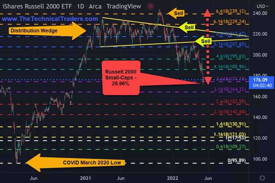 RUSSELL 2000 SMALL CAPS -29.96% The Russell 2000 stock index is considered the bellwether of the US economy. The index measures the performance of 2,000 smaller companies whose focus is on the US market. Tracking this index gives us a broad overview of the health of the overall stock market. Since bottoming in March of 2020, the IWM has more than doubled. But in November 2021, the IWM put in its final top. Upon completing and then breaking out of a distribution wedge, the IWM is now solidly in a bear market. Knowing this information tells us that we should seriously consider we are in a period of risk-off, no-trade, and cash as a position. For experienced traders, they may consider buying non-leveraged inverse index ETFs on days when the market has a sharp spike rally up. ISHARES • RUSSELL 2000 ETF • IWM • ARCA • DAILY
