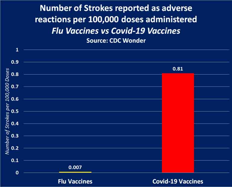 This means the Covid-19 injections are 115 times / 11,361% more likely to cause the recipient to suffer a stroke than the flu vaccines.