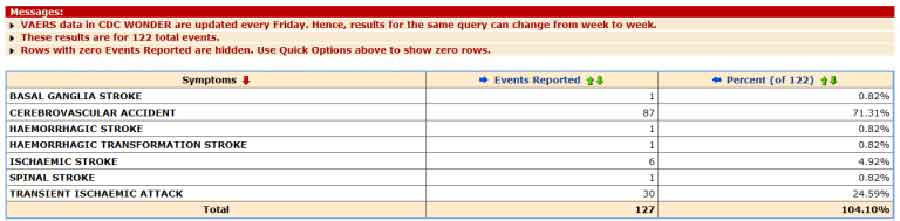 But performing a similar search of the VAERS database on the number of strokes suffered as an adverse reaction to the Flu vaccines reveals that between 2008 and 2020 there were a total of just 122 adverse events reports involving stroke were made in a period of 13 years.