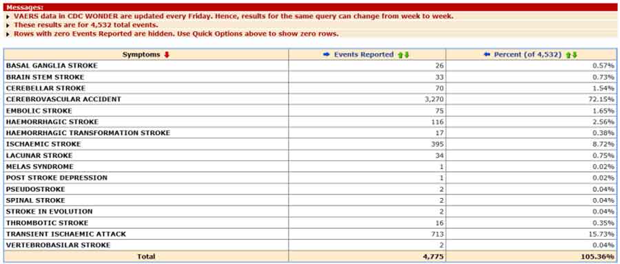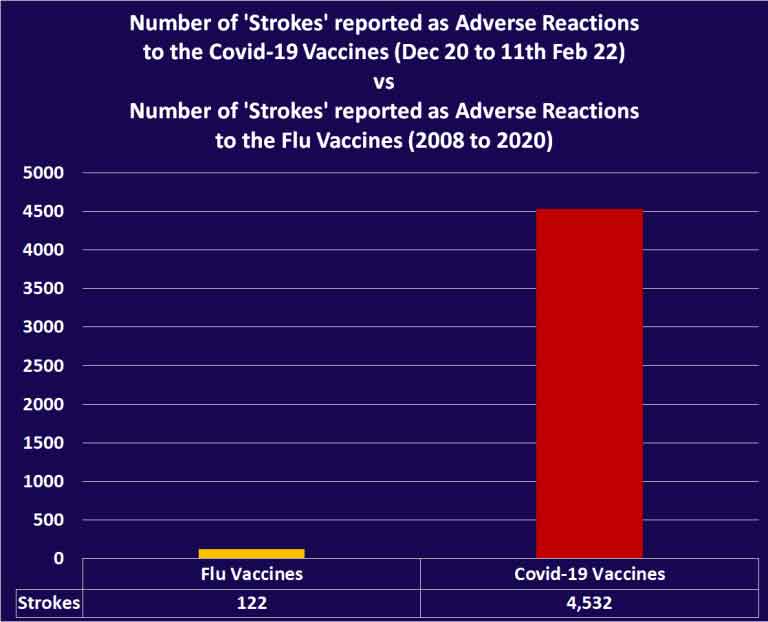 A quick search of the CDC VAERS database on the number of strokes reported as adverse reactions to the Covid-19 injections since they were first rolled out in the USA, reveals that from December 2020 up to 11th Feb 2022, a total of 4,532 adverse event reports involving a stroke were made in just 1 year and 2 months.