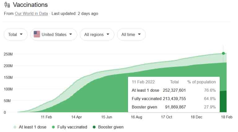 Whereas from the start of the Covid-19 vaccination campaign up to 11th Feb 22 there were a total of 557,637,223 (557.6 million) doses of the Covid-19 vaccine administered in the USA.