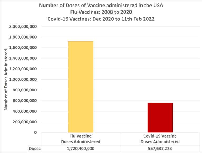 Therefore, over three times as many Flu vaccines have been administered in the USA over 13 years than Covid-19 injections administered in the USA since the end of 2020.