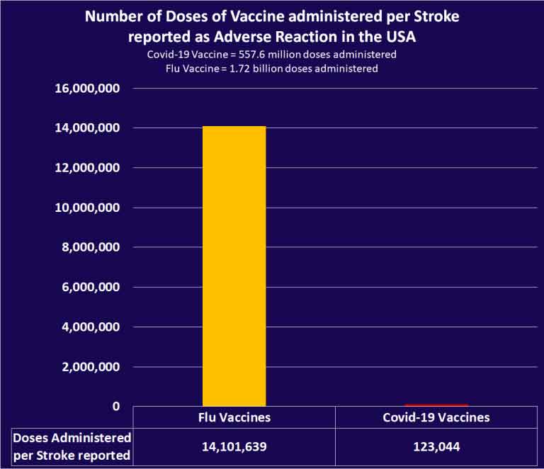 The following chart shows the number of doses of vaccine administered per stroke suffered as an adverse reaction in the USA for both the Flu vaccines and the Covid-19 vaccines.