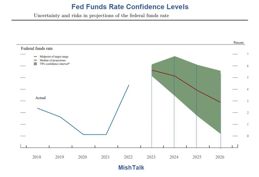 The above chart is particularly amusing. The Fed has only a 70 percent confidence level that interest rates three years from now will be in the range of of 0 to 5.5 percent.