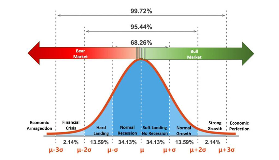 “Investing means cutting through noise, avoiding speculation, and relying on data. For example, the media is jammed with emotionally charged headlines about tariff-induced trade wars, recessions, and de-dollarization. In reality, those events rarely occur. The chart below shows a normally distributed bell curve of potential events and outcomes. In simple terms, 68.26% of the time, typical outcomes occur. Economically speaking, such would be a normal recession or the avoidance of a recession. 95.44% of the time, we are most likely dealing with a range of outcomes between a reasonably deep recession and standard economic growth rates. However, there is a 2.14% chance that we could see another economic crisis like the 2008 Financial Crisis. But what about “economic armageddon?” That event where nothing matters but ‘gold, beanie weenies, and bunker.’ That is a 0.14% possibility.“