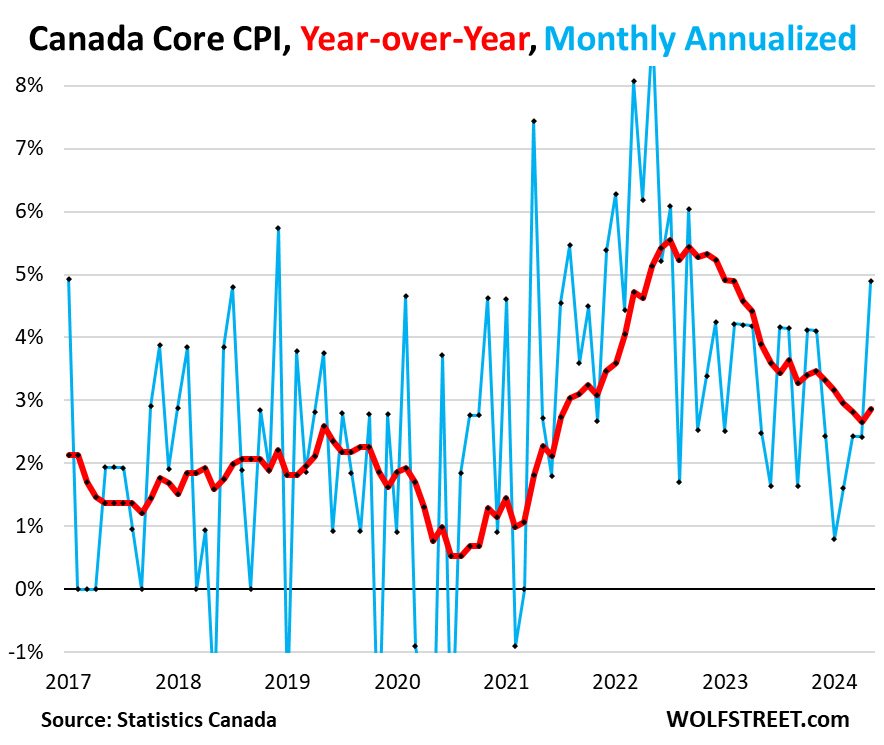 Unfortunately, reality appears to be throwing sand in the gears, because inflation isn’t going away quietly up north, according to Wolf Richter: