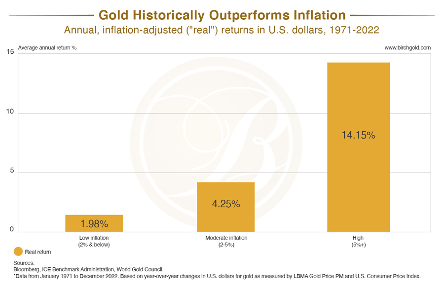That means it’s a good idea for you to consider educating yourself about the diversification benefits of inflation-resistant investments. One of those inflation-resistant investments (and arguably the best of them) is physical gold. That’s because physical gold consistently outperforms inflation, and has done so since 1971. When inflation is high, gold rises even higher: