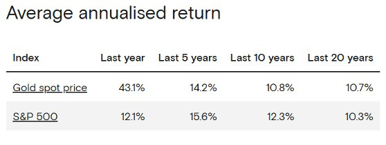…and the S&P 500, which gold (as per curvo.eu) has outperformed for the last 20 years at both an annualized and total return basis:
