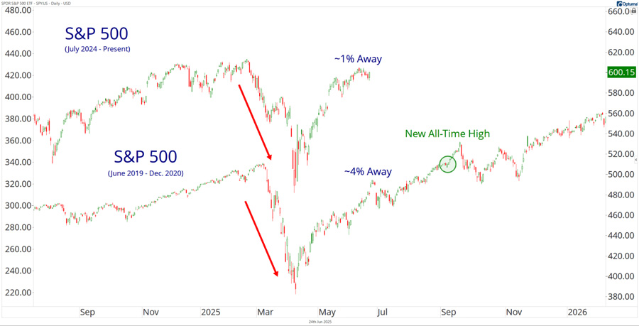 PLTR may be trading on another plane, but the broader market is undoubtedly due for a correction. Check out SPY’s 2020 V-bottom overlaid with this year’s recovery: